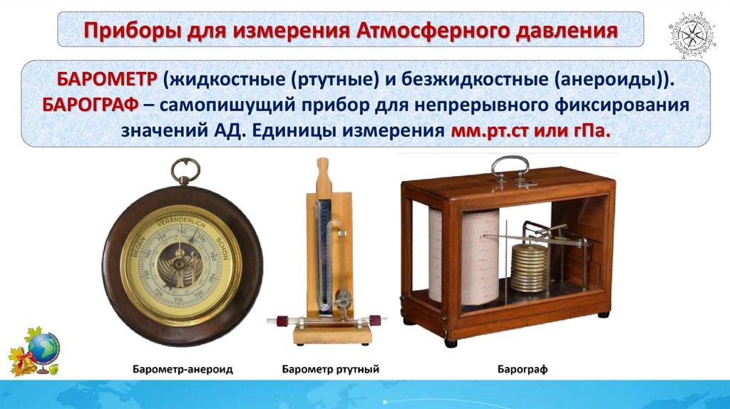 Приборы для измерения Атмосферного давленияБАРОМЕТР (жидкостные (ртутные) и безжидкостные (анероиды)).