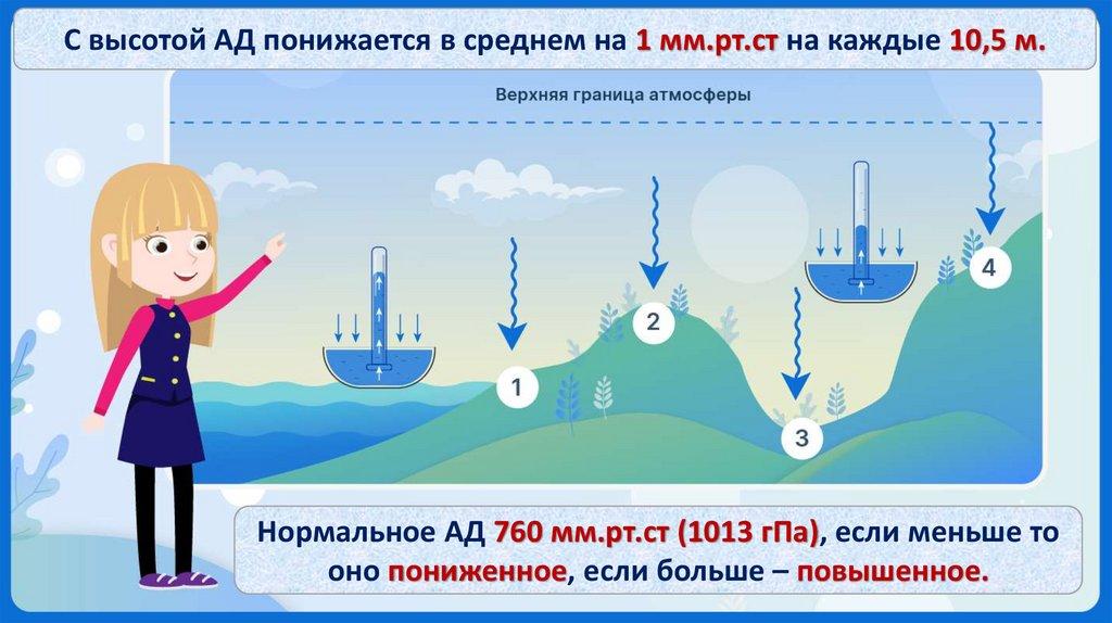 С высотой АД понижается в среднем на 1 мм.рт.ст на каждые 10,5 м.Нормальное АД 760 мм.рт.ст (1013 гПа), если меньше то