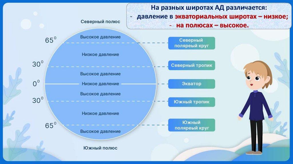 На разных широтах АД различается:- давление в экваториальных широтах – низкое;