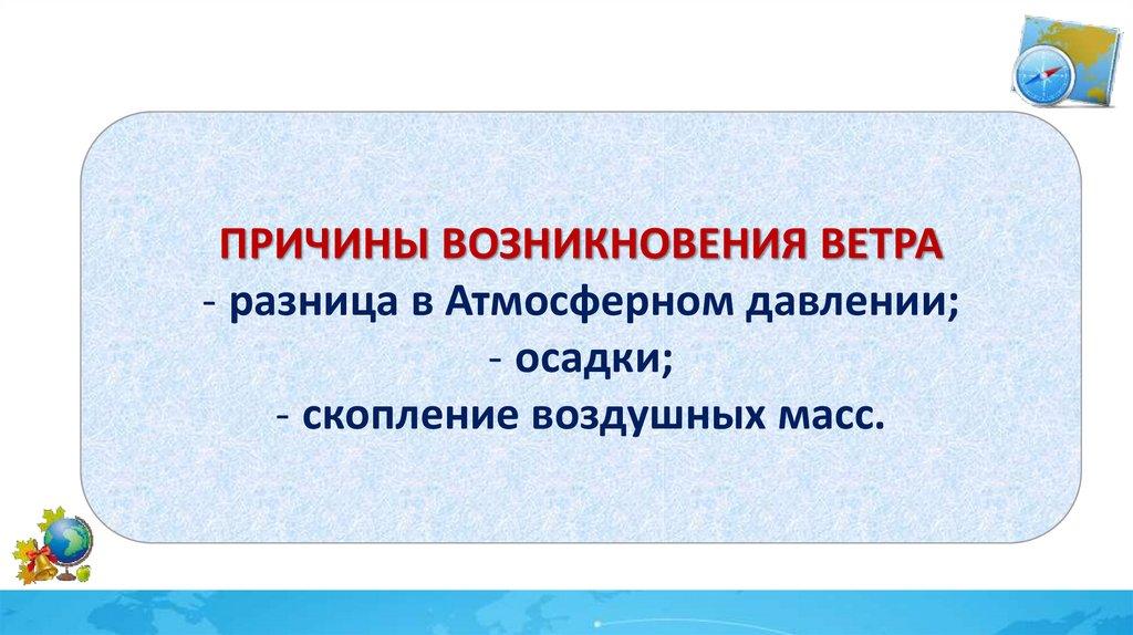 ПРИЧИНЫ ВОЗНИКНОВЕНИЯ ВЕТРА- разница в Атмосферном давлении;