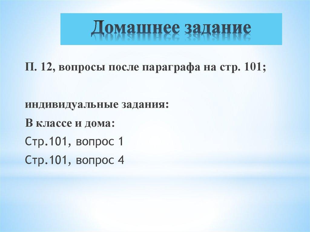 П. 12, вопросы после параграфа на стр. 101;индивидуальные задания: