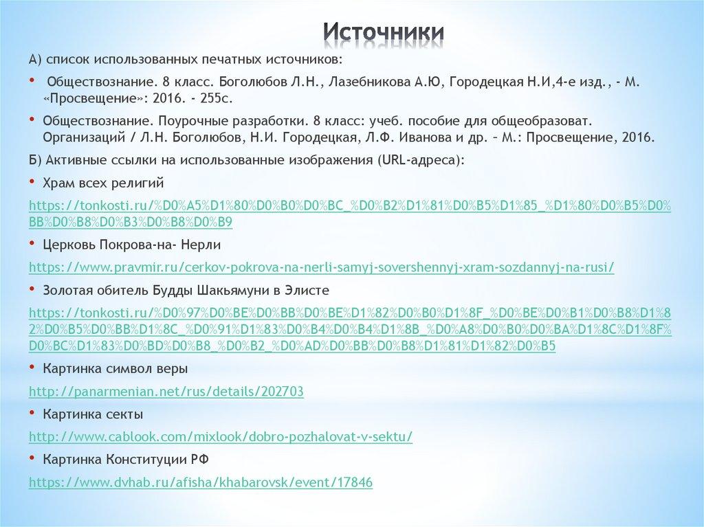А) список использованных печатных источников:Обществознание. 8 класс. Боголюбов Л.Н., Лазебникова А.Ю, Городецкая Н.И,4-е изд., - М.