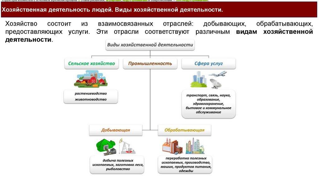 Структура хозяйства с течением времени прошла 3 этапа развития: аграрный, индустриальный и современный — постиндустриальный.Хозяйственная деятельность людей. Виды хозяйственной деятельности.