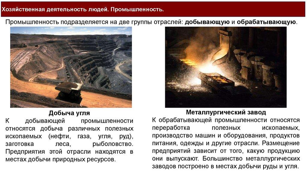Хозяйственная деятельность людей. Промышленность.Промышленность подразделяется на две группы отраслей: добывающую и обрабатывающую.