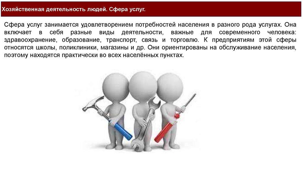 Хозяйственная деятельность людей. Сфера услуг.Сфера услуг занимается удовлетворением потребностей населения в разного рода услугах. Она