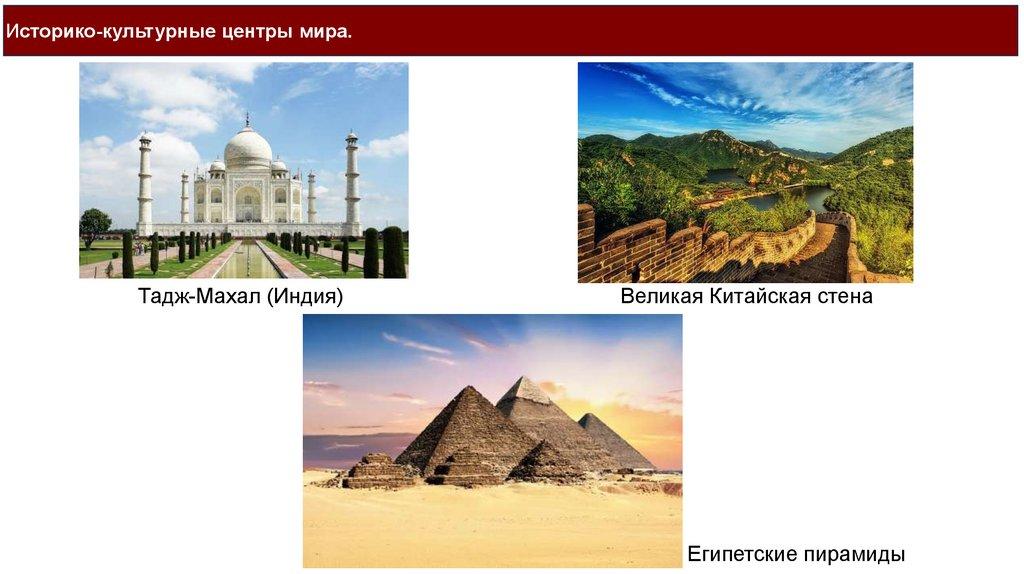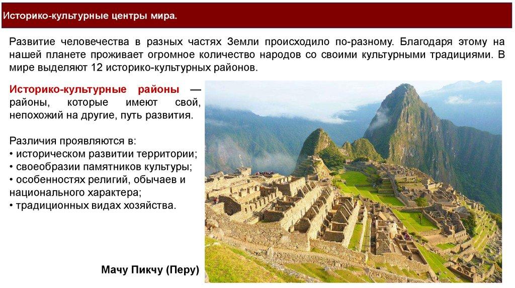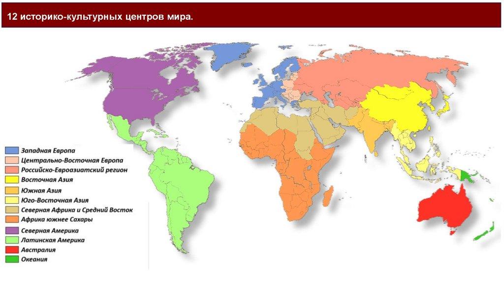 Историко-культурные центры мира.Развитие человечества в разных частях Земли происходило по-разному. Благодаря этому на