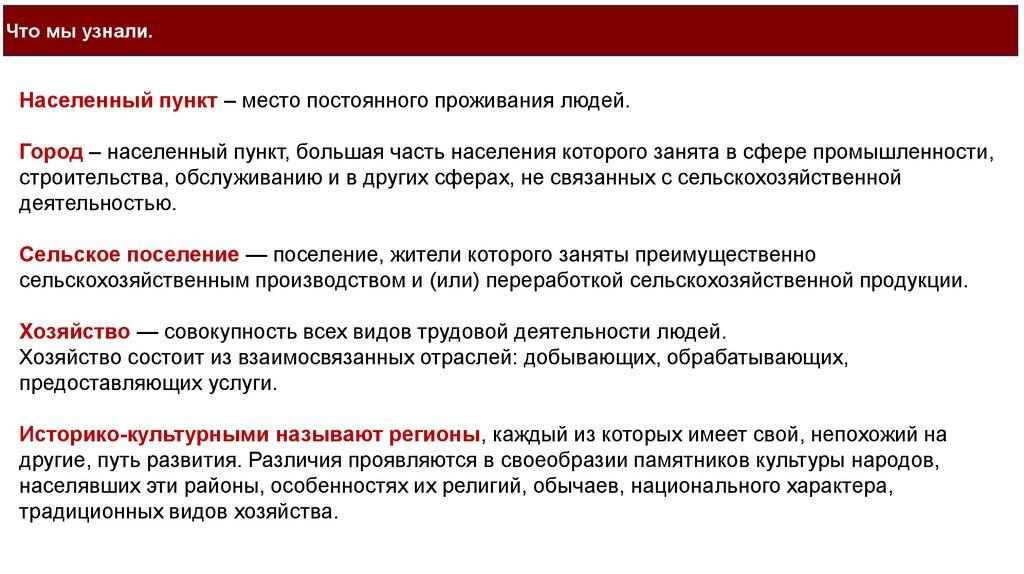 Что мы узнали.Населенный пункт – место постоянного проживания людей.