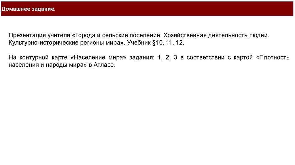 Домашнее задание.Презентация учителя «Города и сельские поселение. Хозяйственная деятельность людей.
