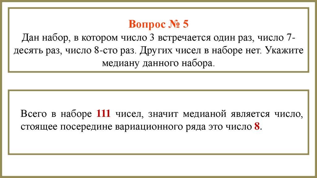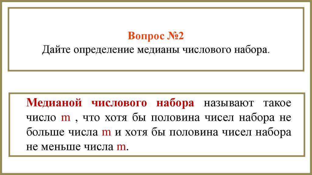 Вопрос №2Дайте определение медианы числового набора.