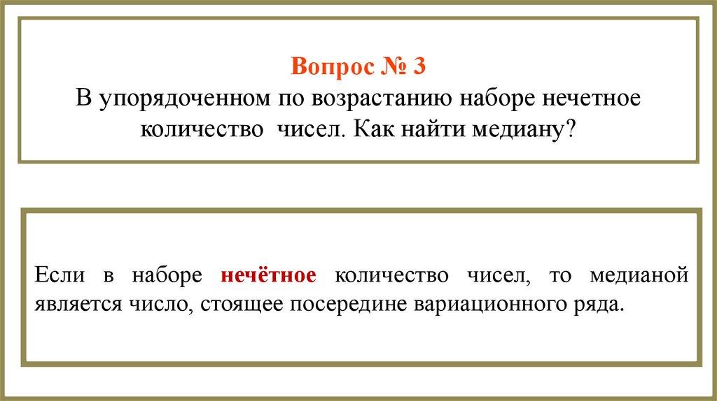 Вопрос № 3В упорядоченном по возрастанию наборе нечетное