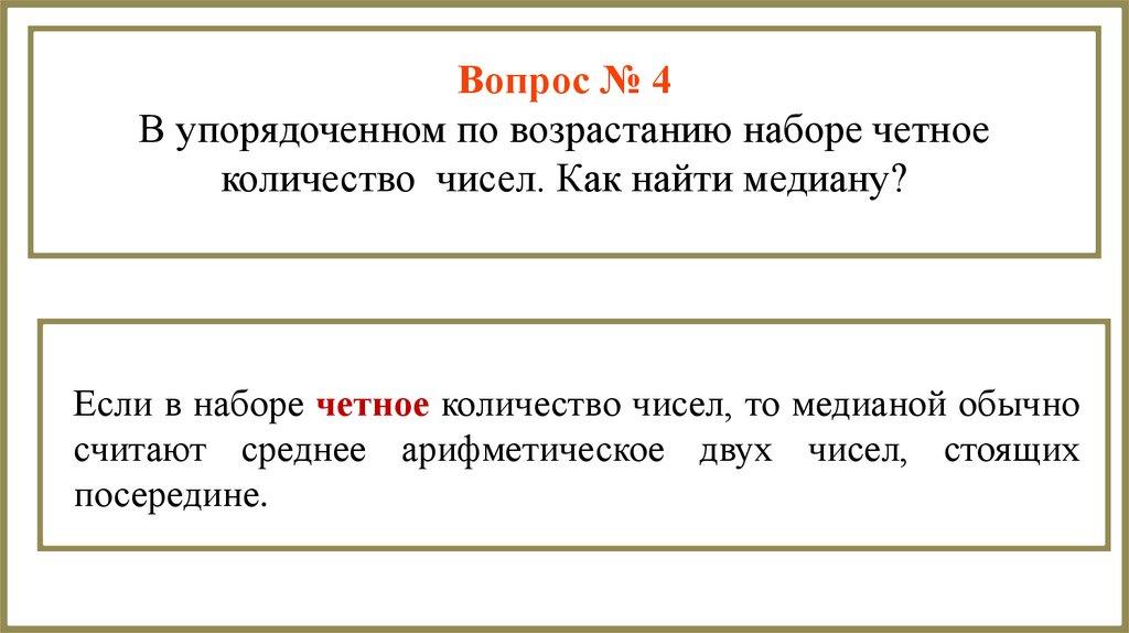 Вопрос № 4В упорядоченном по возрастанию наборе четное