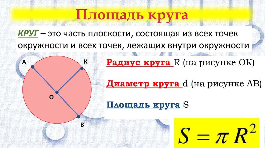 Площадь кругаКРУГ – это часть плоскости, состоящая из всех точек