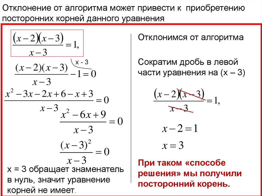 Отклонение от алгоритма может привести к приобретениюпосторонних корней данного уравнения