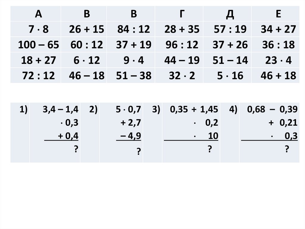100 – 65 60 : 12 37 + 19