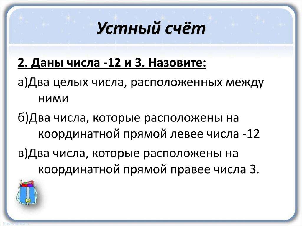 Устный счёт2. Даны числа -12 и 3. Назовите: