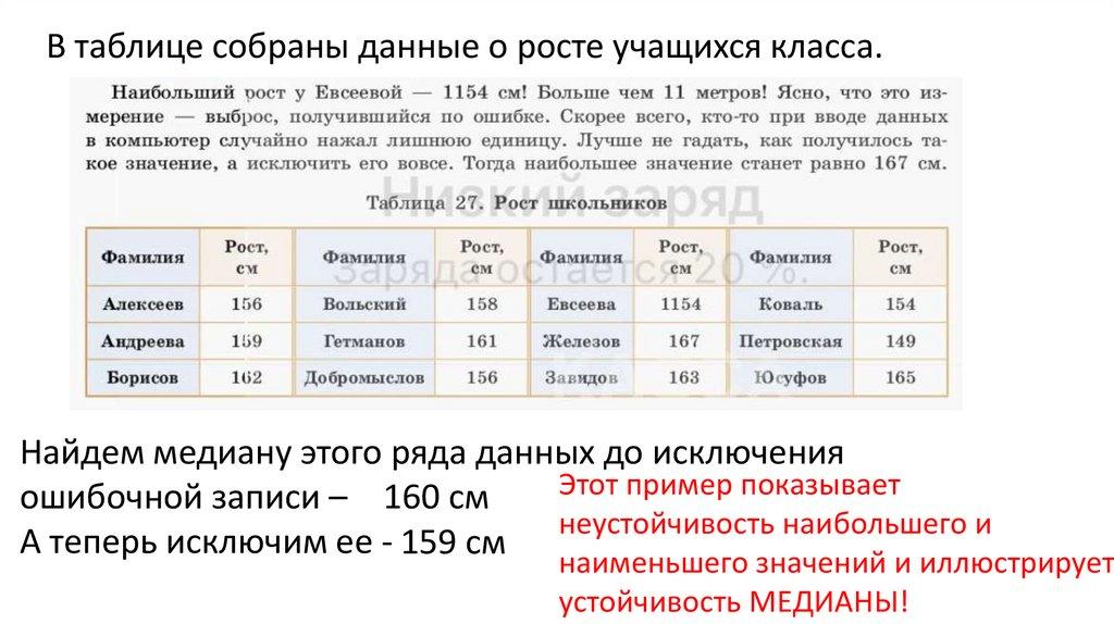 В таблице собраны данные о росте учащихся класса.Найдем медиану этого ряда данных до исключения