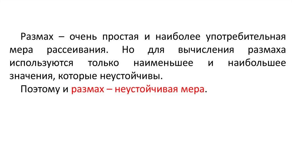 Размах – очень простая и наиболее употребительнаямера рассеивания. Но для вычисления размаха