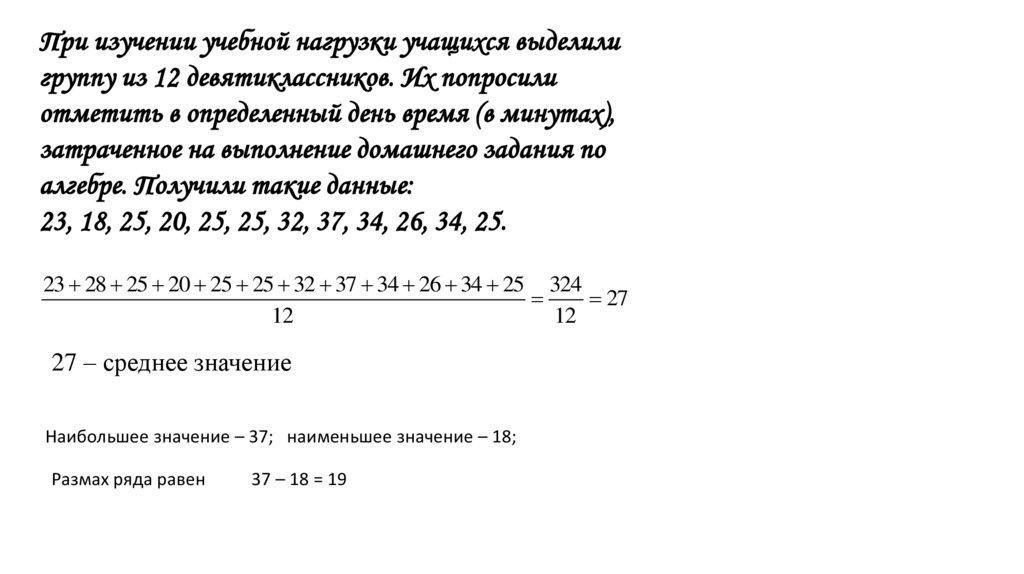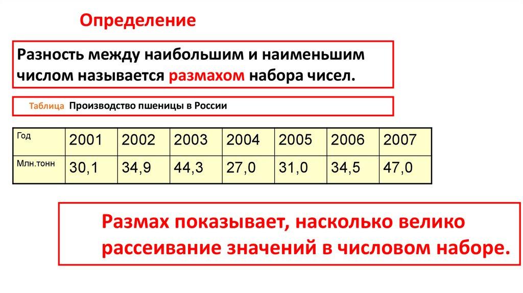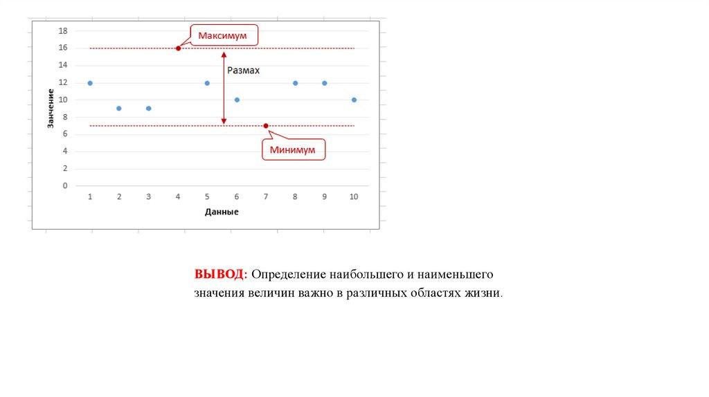 одинаковые значения. Большой размах показывает, что некоторая величина принимает