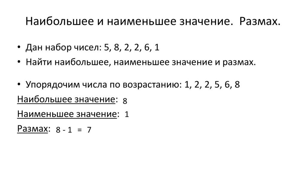 Наибольшее и наименьшее значение. Размах.• Дан набор чисел: 5, 8, 2, 2, 6, 1