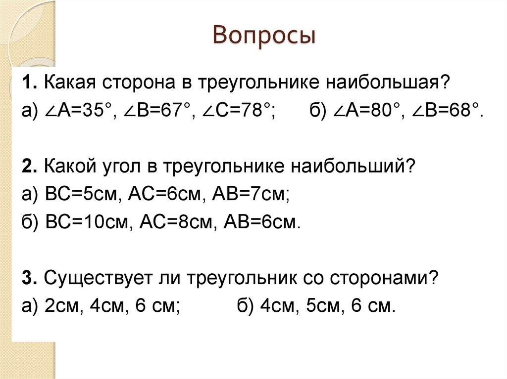 Вопросы1. Какая сторона в треугольнике наибольшая?