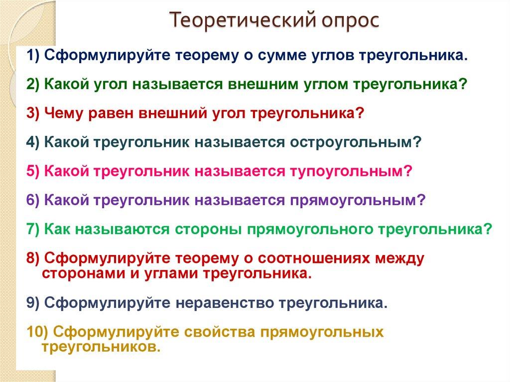 Теоретический опрос1) Сформулируйте теорему о сумме углов треугольника.