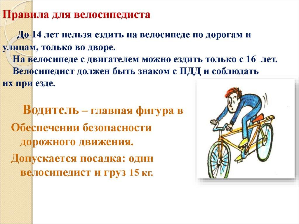 Правила для велосипедистаДо 14 лет нельзя ездить на велосипеде по дорогам и