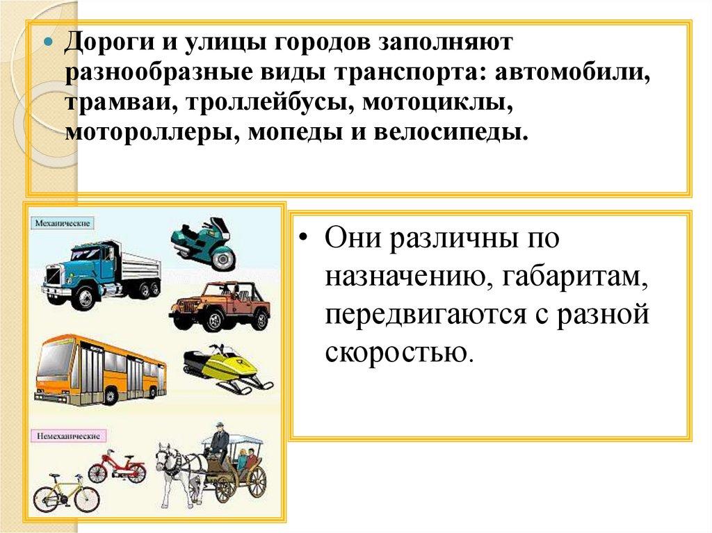 Дороги и улицы городов заполняютразнообразные виды транспорта: автомобили,