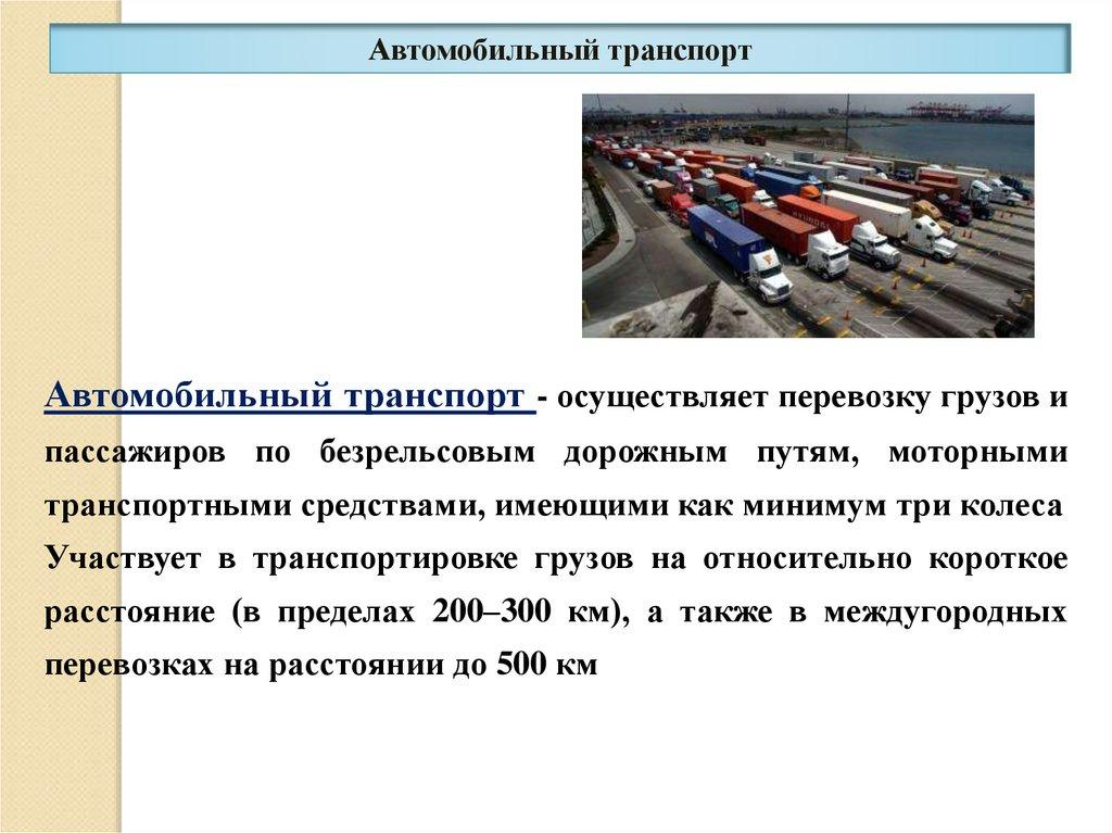Автомобильный транспортАвтомобильный транспорт - осуществляет перевозку грузов и