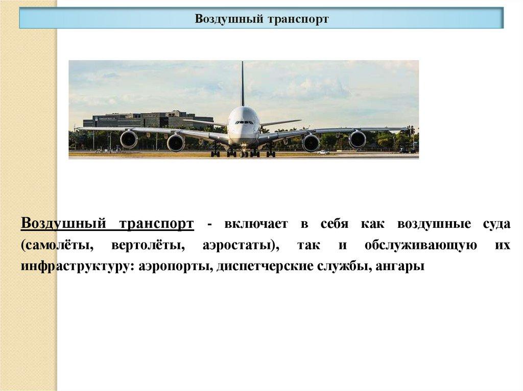 Воздушный транспортВоздушный транспорт - включает в себя как воздушные суда