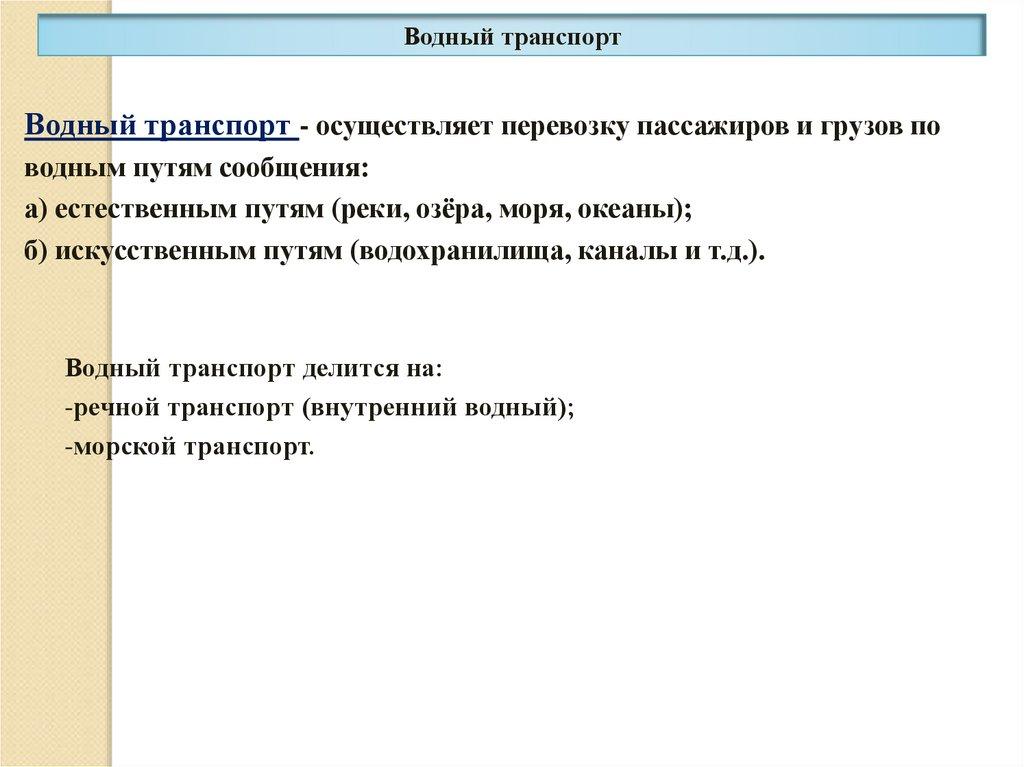Водный транспортВодный транспорт - осуществляет перевозку пассажиров и грузов по