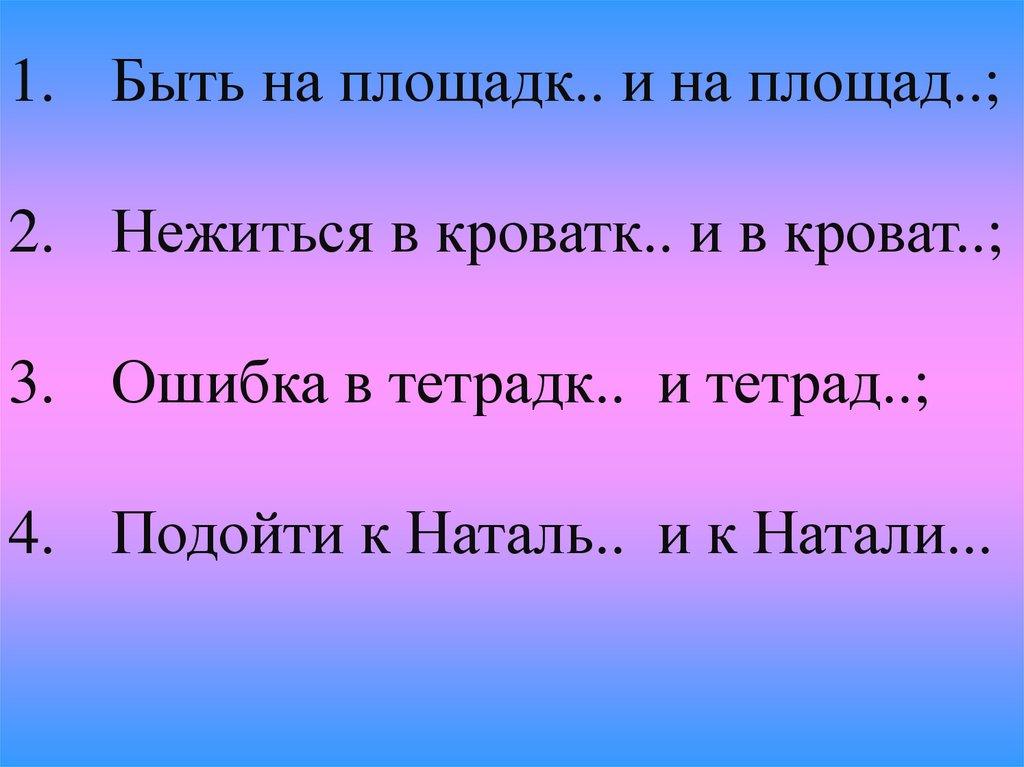 1. Быть на площадк.. и на площад..;2. Нежиться в кроватк.. и в кроват..;