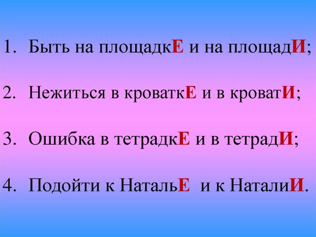 1. Быть на площадкЕ и на площадИ;2. Нежиться в кроваткЕ и в кроватИ;
