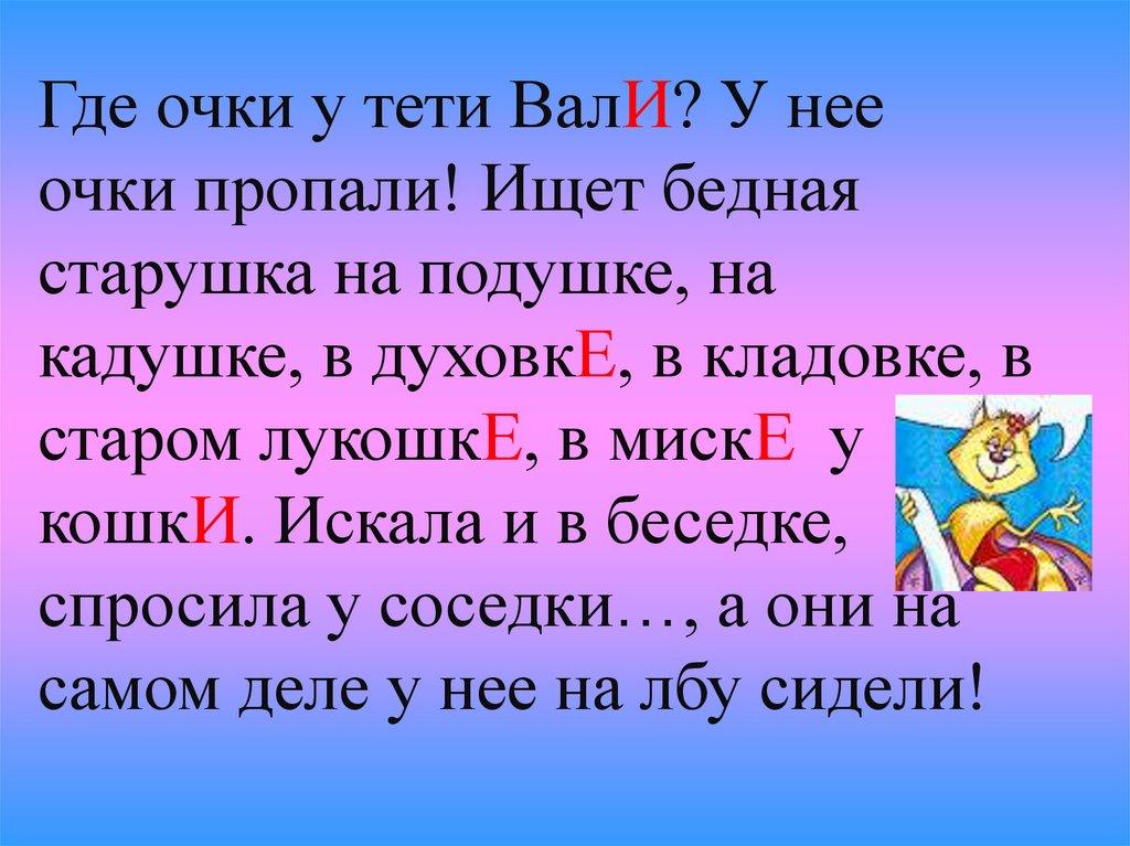 -Где очки у тети Вале? У нее очки