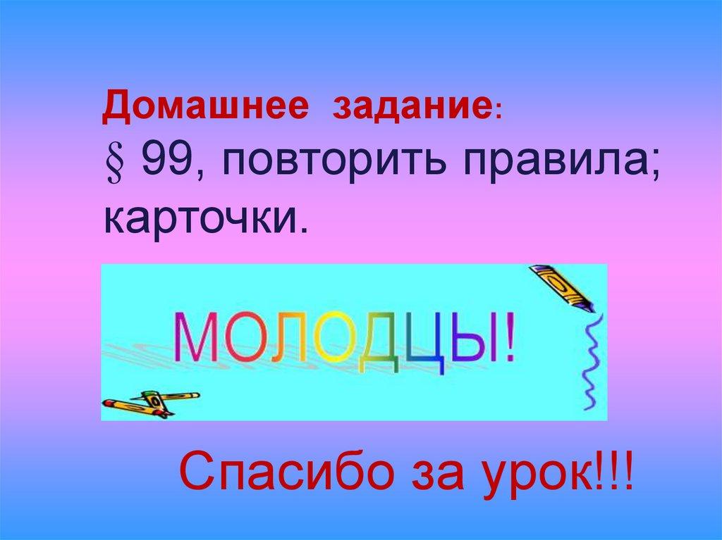 Домашнее задание:§ 99, повторить правила;