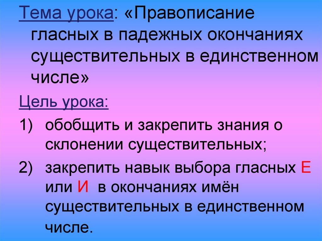 Тема урока: «Правописаниегласных в падежных окончаниях