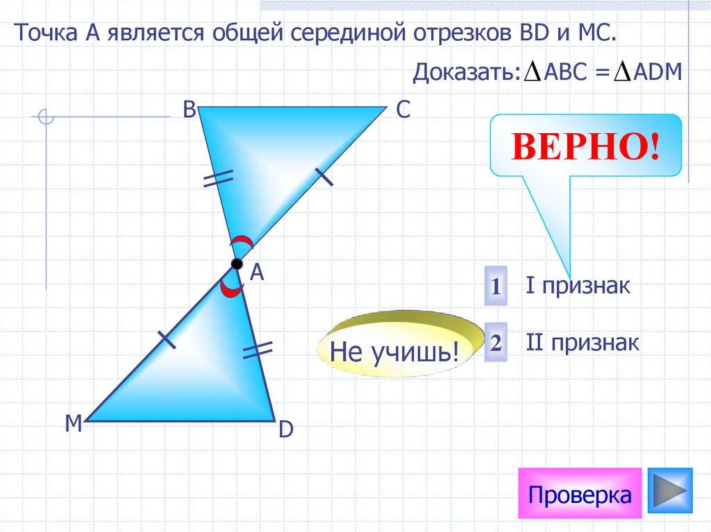 Точка А является общей серединой отрезков ВD и МС.Доказать: АВС = АDМ