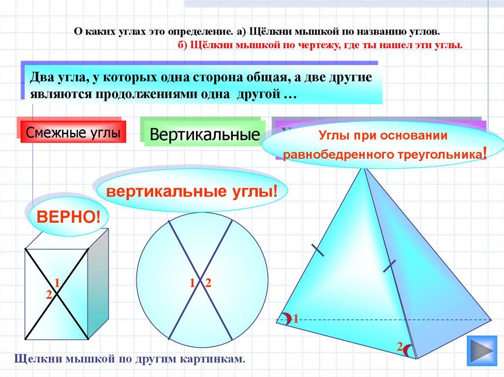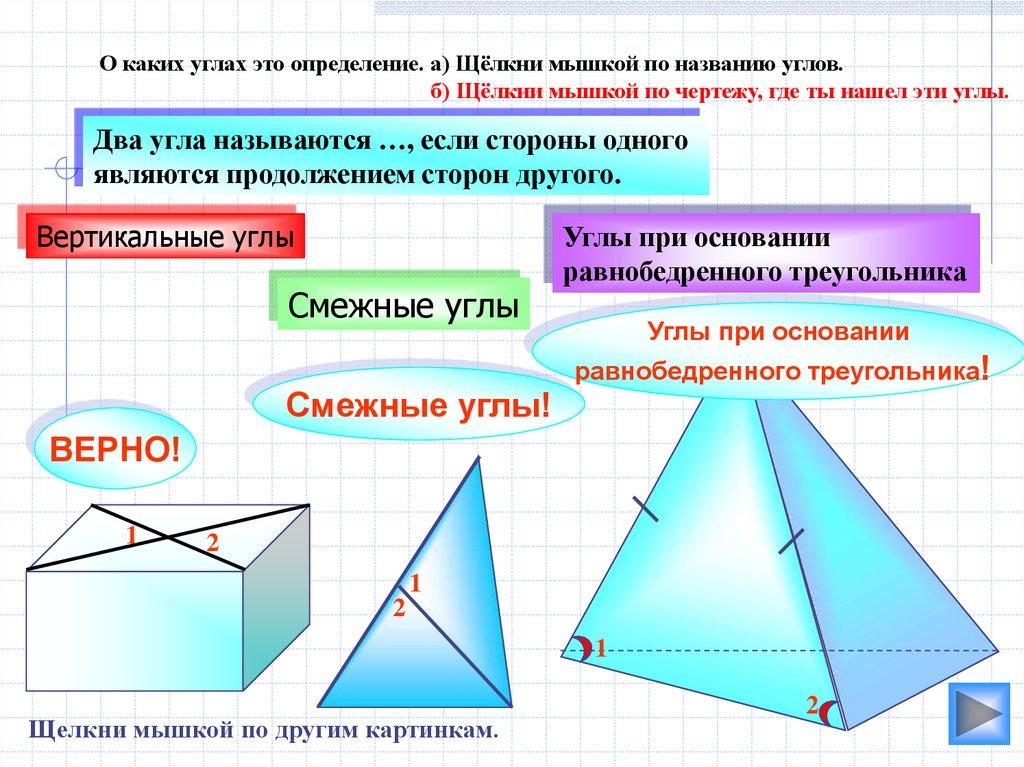 О каких углах это определение. а) Щёлкни мышкой по названию углов.б) Щёлкни мышкой по чертежу, где ты нашел эти углы.