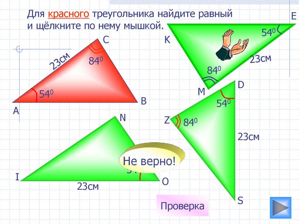 Для красного треугольника найдите равныйи щёлкните по нему мышкой.