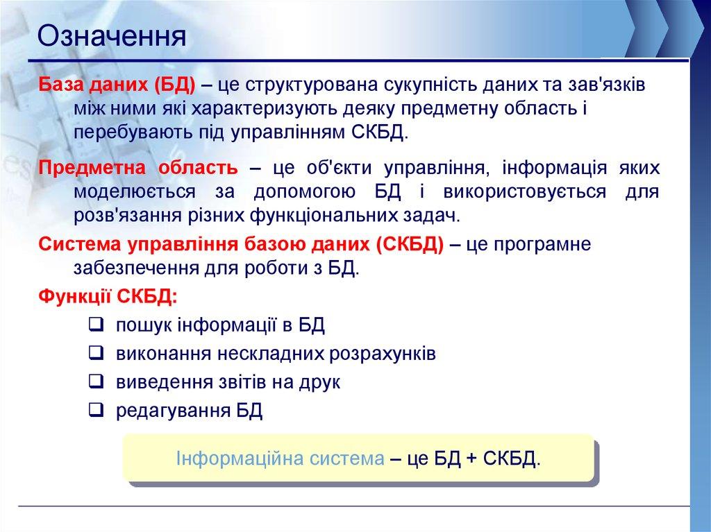 ОзначенняБаза даних (БД) – це структурована сукупність даних та зав'язків