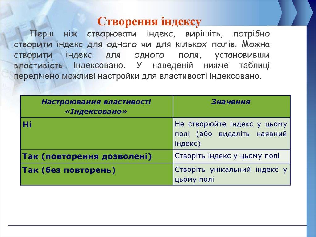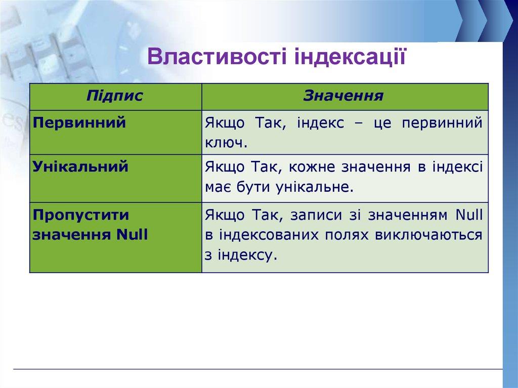 Властивості індексаціїПідпис
