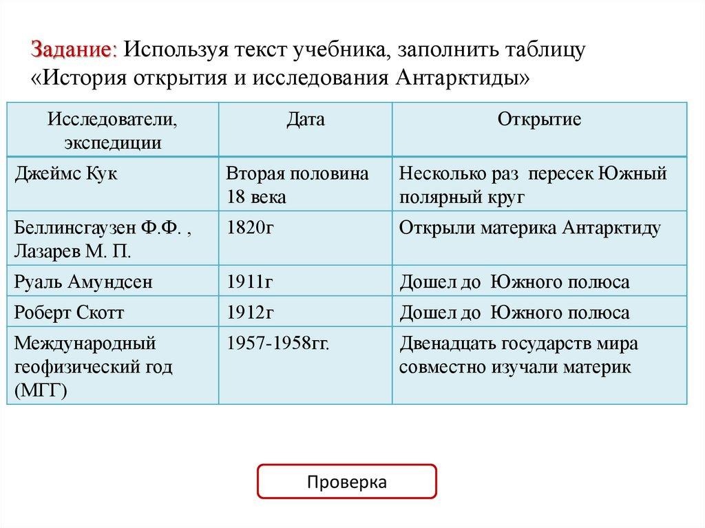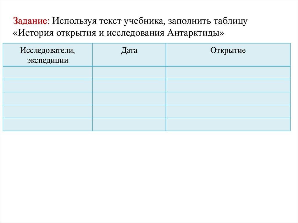 Задание: Используя текст учебника, заполнить таблицу«История открытия и исследования Антарктиды»