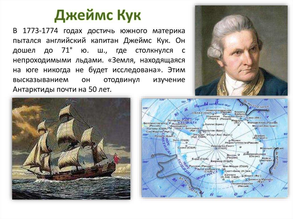 В 1773-1774 годах достичь южного материкапытался английский капитан Джеймс Кук. Он