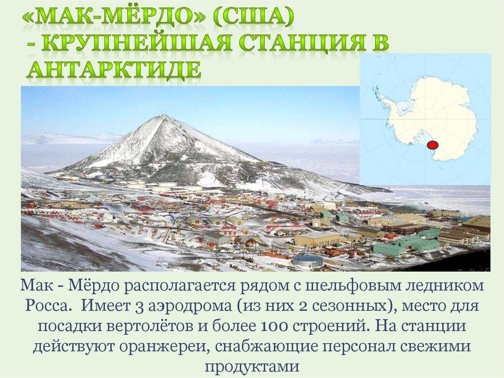 Мак - Мёрдо располагается рядом с шельфовым ледникомРосса. Имеет 3 аэродрома (из них 2 сезонных), место для