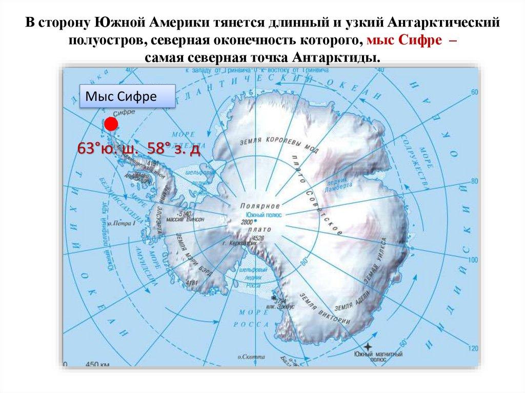В сторону Южной Америки тянется длинный и узкий Антарктическийполуостров, северная оконечность которого, мыс Сифре –