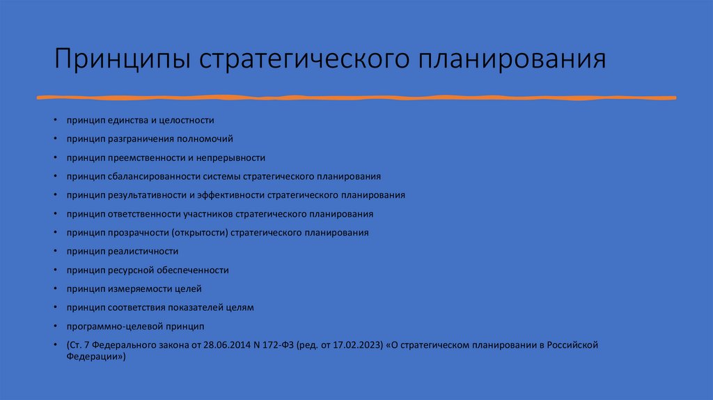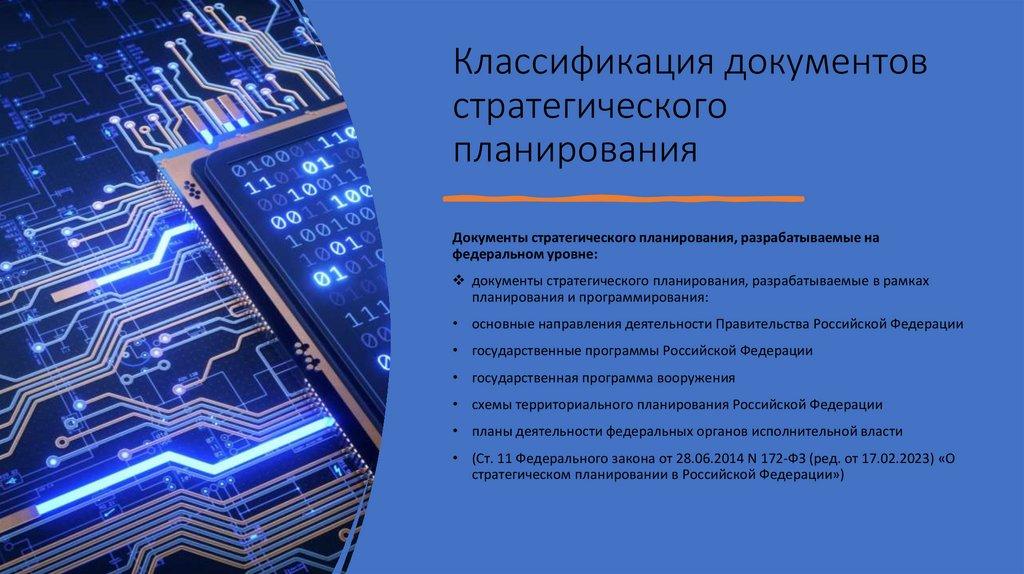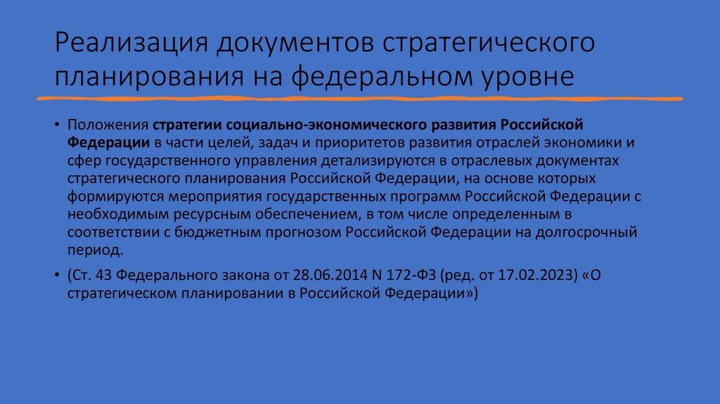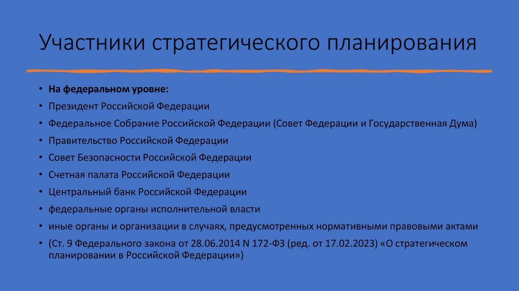 Федеральный закон от 28.06.2014 N 172-ФЗ (ред. от 17.02.2023) «О стратегическом планировании в Российской Федерации» // Официальный интернетпортал правовой информации http://pravo.gov.ru, 30.06.2014.