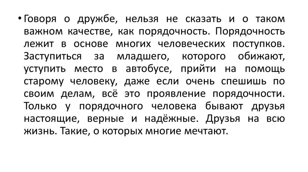 • Говоря о дружбе, нельзя не сказать и о такомважном качестве, как порядочность. Порядочность