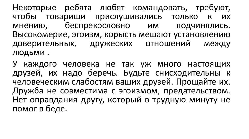 Дружба не совместима с эгоизмом, предательством.