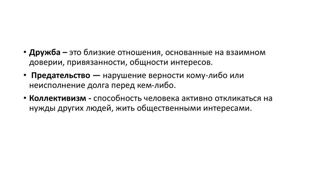 • Дружба – это близкие отношения, основанные на взаимномдоверии, привязанности, общности интересов.