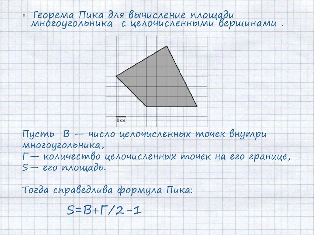 • Теорема Пика для вычисление площадимногоугольника с целочисленными вершинами .
