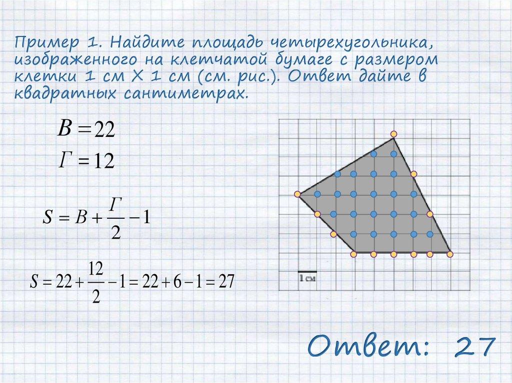Пример 1. Найдите площадь четырехугольника,изображенного на клетчатой бумаге с размером